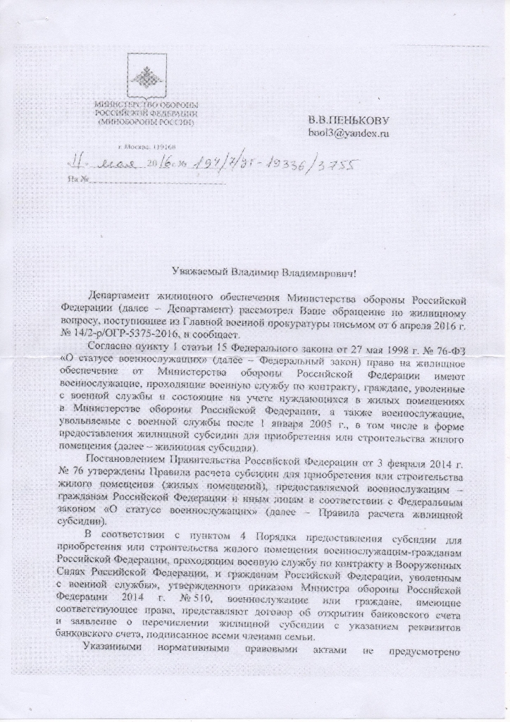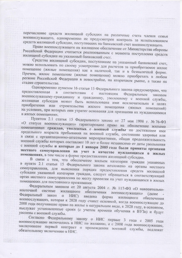 #69Прочитала я последнее предложение на первой странице и продолжение на второй. Да только там не написано, что деньги военнослужащего. Там написано, что перечисление денег на разные счета не предусмотрено. Но деньги то даются с расчетом на всех членов семьи. А если на одного военнослужащего, то там на порядок меньше. Если я правильно поняла, что бы не было всего этого гемороя, военнослужащему надо разводится и получать на себя. А так можно без штанов остаться.А Постановление Правительства о субсидии читали??? От кого перечисляются средства? И за чьи заслуги??QR_BBPOST Я лично сто раз перечитала ответ из МО и не увидела ни слова о том, что деньги военнослужащего, а не членов семьи.