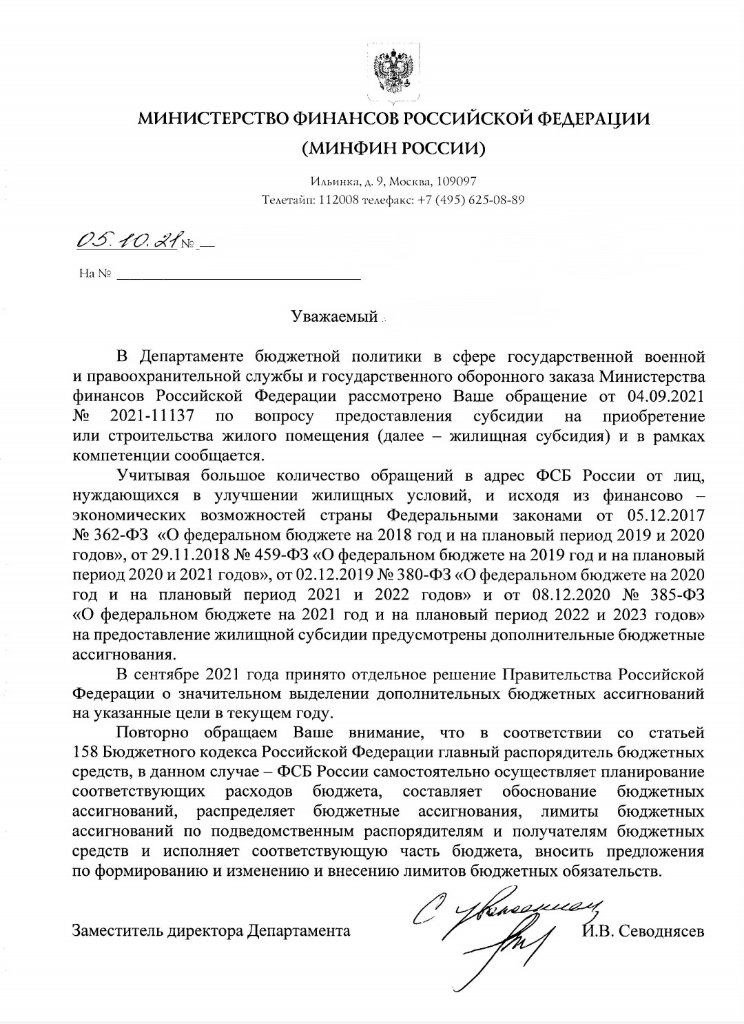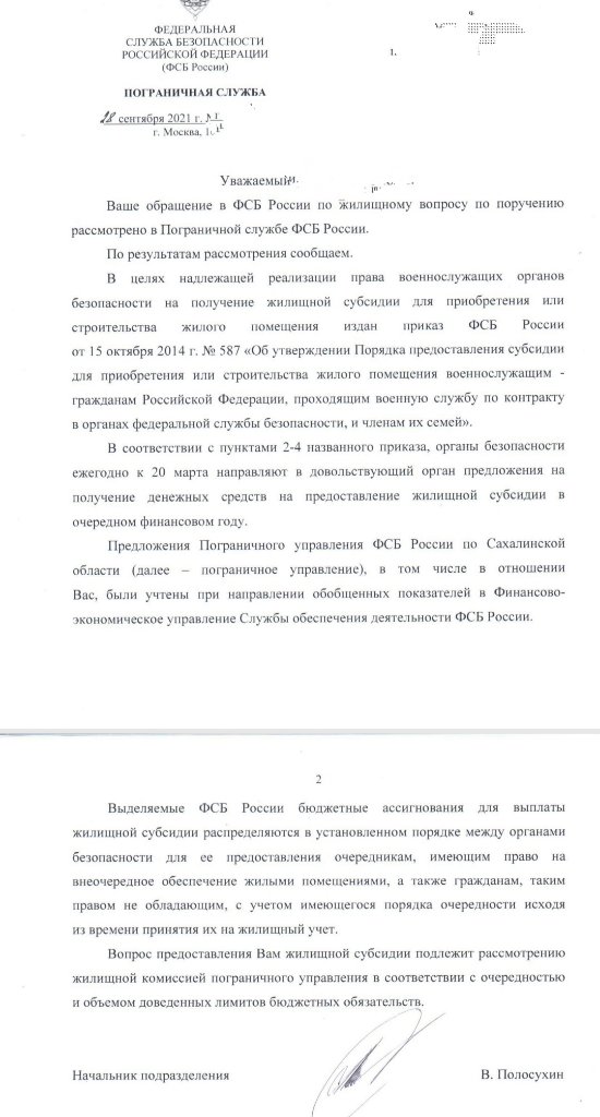 Обращения сотрудников ФСБ, ПС по жилищной субсидии