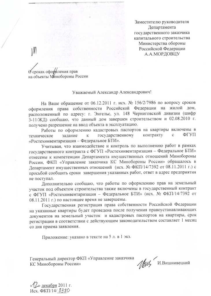 А в главную военную прокуратуру Рф Вы ещё не обращались??????????? Я так понимаю Вы единственный из нас кто заключил ДКН и это на сегодняшний день Вашь козырь........... Обращение необходимо будит писать сразу в два адреса которые так и указать в шапке обращения в вверхнем правом углу 1) в адрес правительства РФ (будующему гаранту); 2) А ниже в адрес главной военной прокуратуры РФ. Так и писать что соглсно извещения №... от .... мне и моей семье была распределена ДЖО МО РФ квартира по адресу:..... . Такого то сентября 2011 года мной был заключен ДКН на данную квартиру и до сегодняшнего дня я не могу не точто в неё вселится, а даже элементарно получить от неё ключи, чем в соответствии с ............ нарушены мои права. И далее обращался туда то туда то, меня послали туда то туда то и по возможности прилагать копии доков. В результате моих мытарств мне удалось выяснить то-то то-то, в подтверждение моих слов прилагаю то-то то-то и тд и тп чем подробней тем лудьше не жалейте бумаги она всё стерпит.... В приложение обязательно приложить копии: Вашего извещения, ДКН, и далее всё что у Вас есть (тоесть копии Ваших писменных обращений и ответы на них и тд и тп чем больше тем лудьше)..... В заключении слёзно прошу Вас разобраться в этом беспределе и принять дественные меры, "С превеликим уважением", число, целую Ф_О_В и Ваш автограф.Данное обращение обязтельно необходимо отправить почтой (не пожалейте 300 руб) письмом первого класса с объявленной ценностью и описью вложений по форме 107 (причем в описи первым пунктом указать данное обращение с частичным передачей самого текста, хотябы основные моменты и тд по порядку все доки) (соответственно опись по форме 107 приготовить заранее в распечатоном виде на формате А4 в 2-х экземплярах (один в конверт, а второй Вашь с подписью специалиста почты о проверке доков и оттиском календарного штемпеля почты), а не мудохаться писать её от руки на бланках почты), с заказным уведомлением о вручении адресату, и таким макаром отправить по комплекту в каждый из вышеозвученных адресатов. Считаю это единственный способ реально их расшивелить и реально ускорить процесс............По дому на Черниговской написал письмо в ФГУ Приволжско-Уральского территориального управления имущественных отношений написал заявление, а письмо, отправленное 29.12.11 г. до них почему-то не дошло. Можите пичитать.
