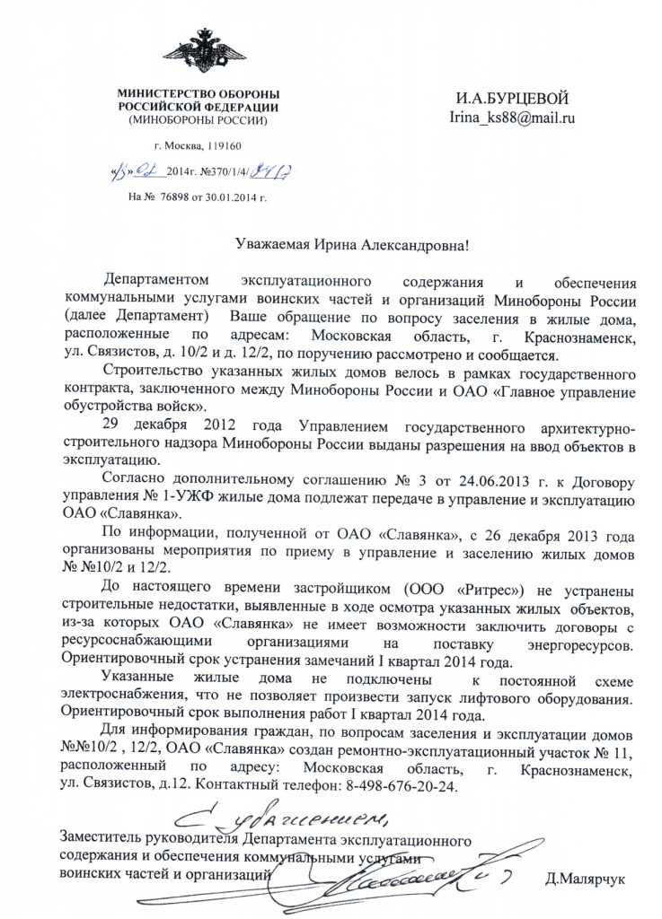 Девиз нашей семьи: вода -камень точит. Вы, действительно, ничего не обязаны делать. А призыв моего мужа (очень категоричный - согласна) относится только к желающим хоть как-то подтолкнуть ситуацию. Возможно у Вас пассивная форма борьбы с МО РФ - получение зарплаты за штатом? Тогда Вам повезло! Но все Ваши комментарии сводятся к одному - критике и "опусканию на землю" всех призывов к действию. А ведь информация о работе прокуратуры, о том, что начальство "стоит на ушах" появляется благодаря обращениям граждан в соответствующие структуры! И -это, я уверена, продвигает нас всех к скорой встрече! Даже в администрации Президента РФ нам сказали: "Будем их долбить до победного!"