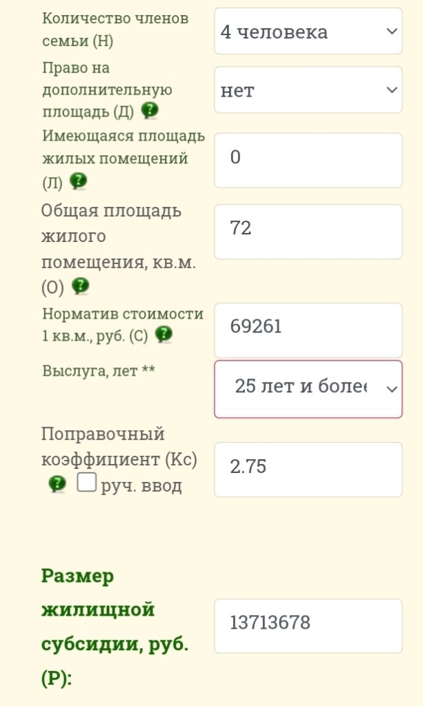 Трудно заработать на гражданке сумму,которая гарантирована для покупки или строительства жилья,(смотри взял по среднему,с учетом измения Минстроя,вложение).Считаю так,что обязанности выполнил в выслуги цать лет, службу щвкончил,есть право на жилье обеспечьте. Зачем издавать законы,если они работают не 100%.Конечно,сроки не установлены законом о выплате.Но не надо доходить до маразма,необходимо властям отточить механизм жилобеспечения и это МЫ должны вместе чиновникам указать.Поэтому: