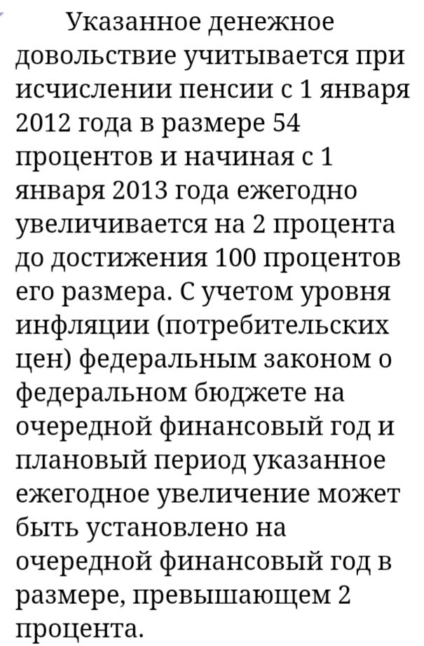 "Указанное денежное довольствие учитывается при исчислении пенсии с 1 января 2012 года в размере 54 процентов и начиная с 1 января 2013 года ежегодно увеличивается на 2 процента до достижения 100 процентов его размера. С учетом уровня инфляции (потребительских цен) федеральным законом о федеральном бюджете на очередной финансовый год и плановый период указанное ежегодное увеличение может быть установлено на очередной финансовый год в размере, превышающем 2 процента."