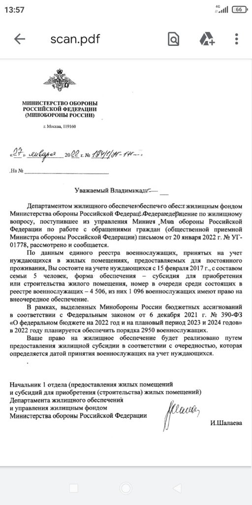 #61158Пришел ответ на мое обращение, из Москвы. На 26 января 2022 года мой номер в очереди 9749, из указанного числа 1085 военнослужащих имеют право на внеочередное обеспечение.Срок получения субсидии, даже примерный, не указан.Дата постановки на учет - 31 октября 2017 года.Отдел "Вологодский" филиала "Западный" "Росжилкомплекс"МО РФ.