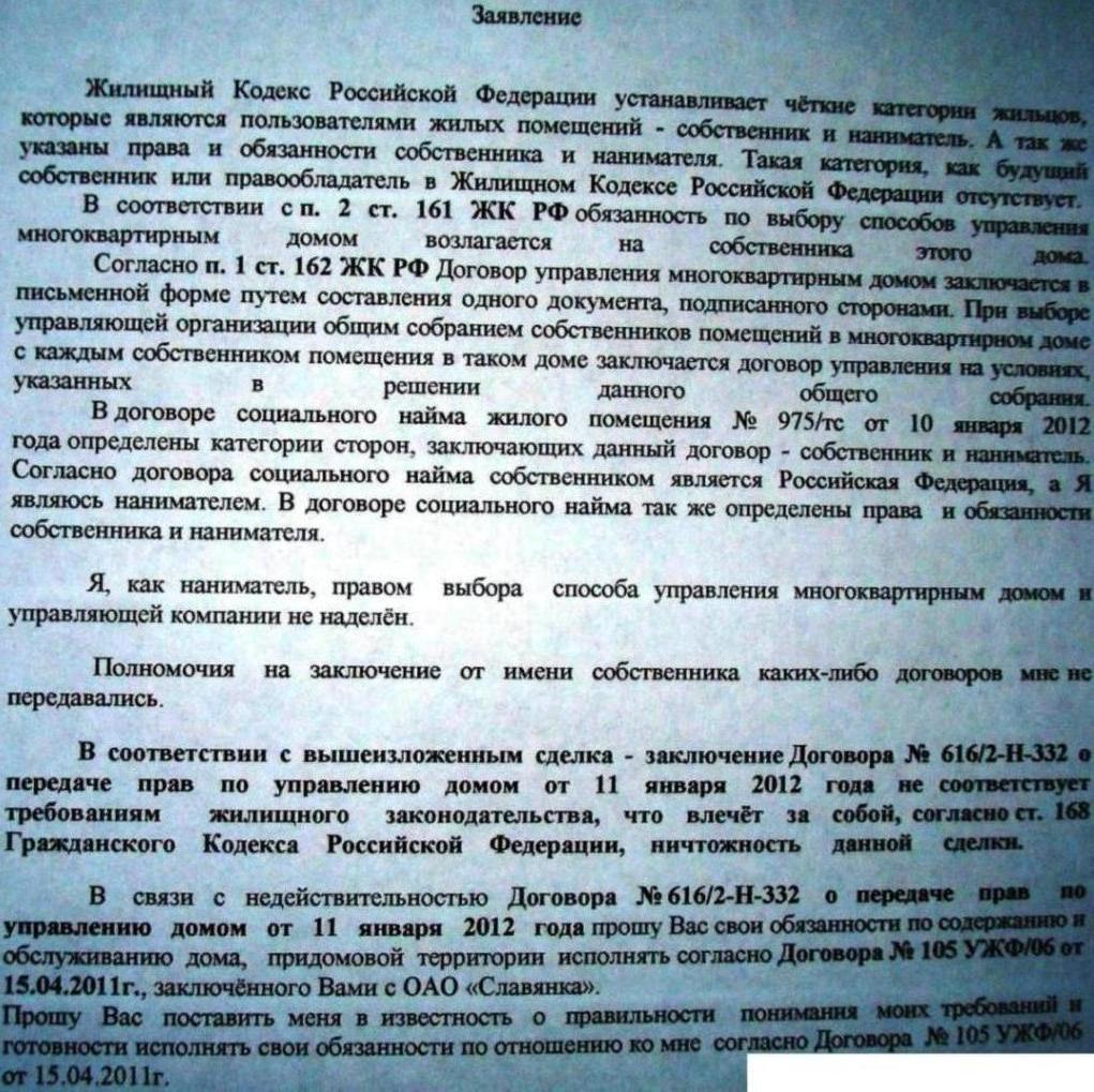 В соответствии с вышеизложенным сделка - заключение Договора на передачу прав по управлению домом № _____от «___»__________20___г. не соответствует требованиям жилищного законодательства, что влечёт за собой, согласно ст. 168 Гражданского Кодекса РФ, ничтожность данной сделки. В связи с не действительностью Договора № ___ от «____»______________20___г. прошу Вас свои обязанности по содержанию и обслуживанию дома, придомовой территории исполнять согласно Договора № 105 УЖФ/06 от 15.04.2011г., заключённого Вами с ОАО «Славянка».