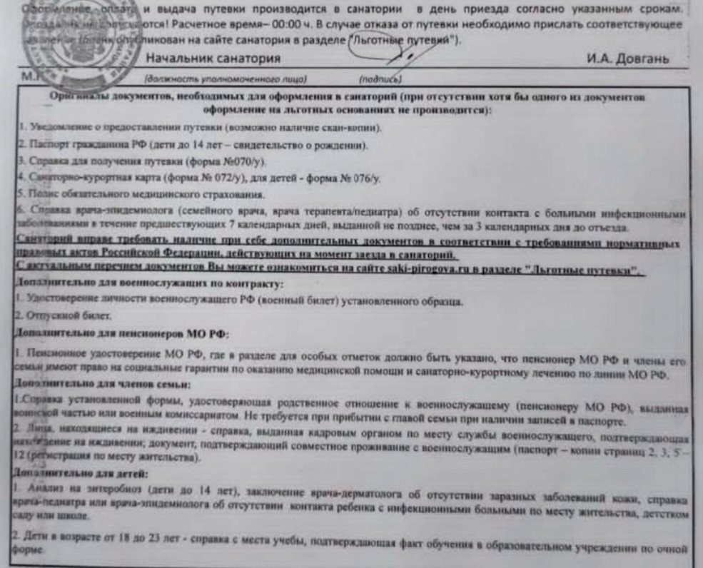 Выкладываю "обрезанное" Уведомление моих знакомых, которые сейчас отдыхают в санатории Пирогова. Смотрим п.3 (справка для ПОЛУЧЕНИЯ ПУТЕВКИ ф. 070/у) Перечня ОРИГИНАЛОВ документов, необходимых для оформления в санаторий.