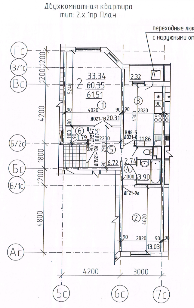 А нет ли, уважаемые, у кого-нибудь такой же схемы распашёнки-двушки 60,3м2 из дома проекта ИП-46ИС (12к.6)?Для желающих прикинуть куда поставить любимое кресло, но не успевших промерить линейную трешку в доме 12/6 схемка из строительного чертежа.