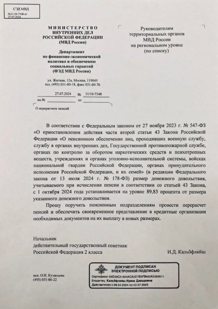 Собственно тут кто то уже выкладывал письмо МВД от 27.07.2024г. по поводу пересмотра военных пенсий с 01.10.2024г.