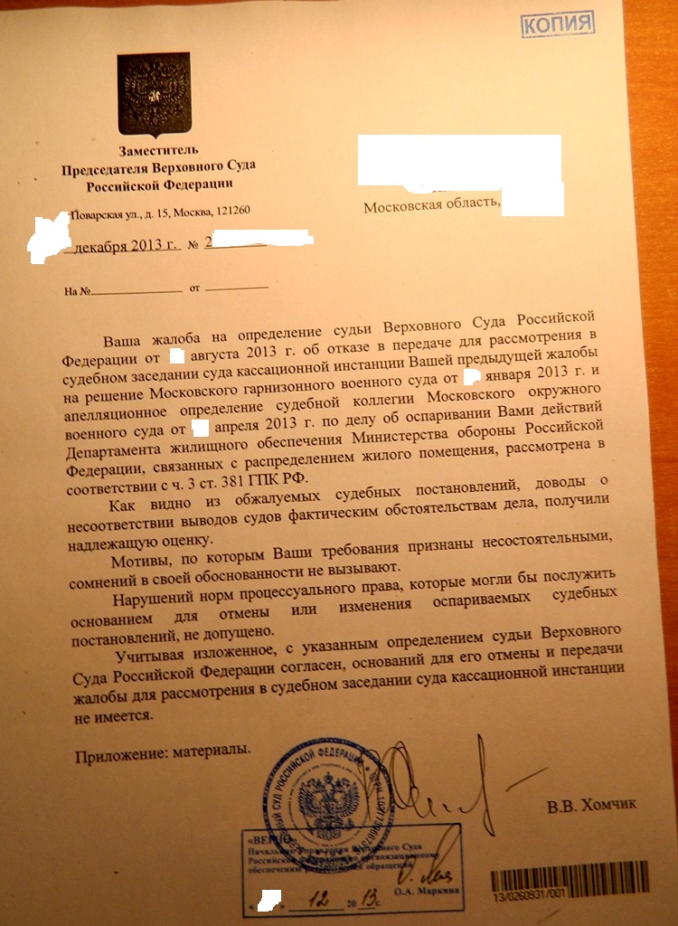 #6365Имхо теперь надзорную жалобу в Президиум ВС РФ, согласно КАС РФ. Этот же судья отказал мне в на мою кассационную жалобу в ВС РФ, что примечательно практически в тех же выражениях. Хотя дело другое, но видимо у них применяется универсальная форма отказа. По результату подал надзорную в Президиум ВС РФ, недавно пришло письмо за подписью какого-то главного консультанта, а не судьи почему-то. Так вот он отказал в рассмотрении по существу и вернул - типа мне надо пройти этап кассационного обжалования в ВС, хотя к надзорной жалобе прилагалось как раз определение по кассационной жалобе в ВС и мной уже пройден этап кассации в ВС РФ. То ли так издеваются, то ли на самом деле такие коекакеры там работают, что в упор не видят документов. Подал повторно через председателя с описанием этих извращений закона его же главного консультанта.QR_BBPOST Куда там далее? К заму Председателя? Или к Председателю?