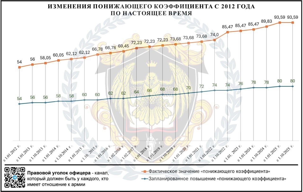 Посмотрел я на предоставленный Вами график. Я не совсем понимаю, что Вы им хотели нам сообщить. Было бы намного интереснее увидеть графики фактического изменения пенсии, в сравнении с тем, какая бы она была если бы "гарант" исполнил бы надлежащим образом Федеральный закон. Для особо забывчивых напомню: "Указанное денежное довольствие учитывается при исчислении пенсии с 1 января 2012 года в размере 54 процентов и начиная с 1 января 2013 года ежегодно увеличивается на 2 процента до достижения 100 процентов его размера. С учетом уровня инфляции (потребительских цен) федеральным законом о федеральном бюджете на очередной финансовый год и плановый период указанное ежегодное увеличение может быть установлено на очередной финансовый год в размере, превышающем 2 процента."