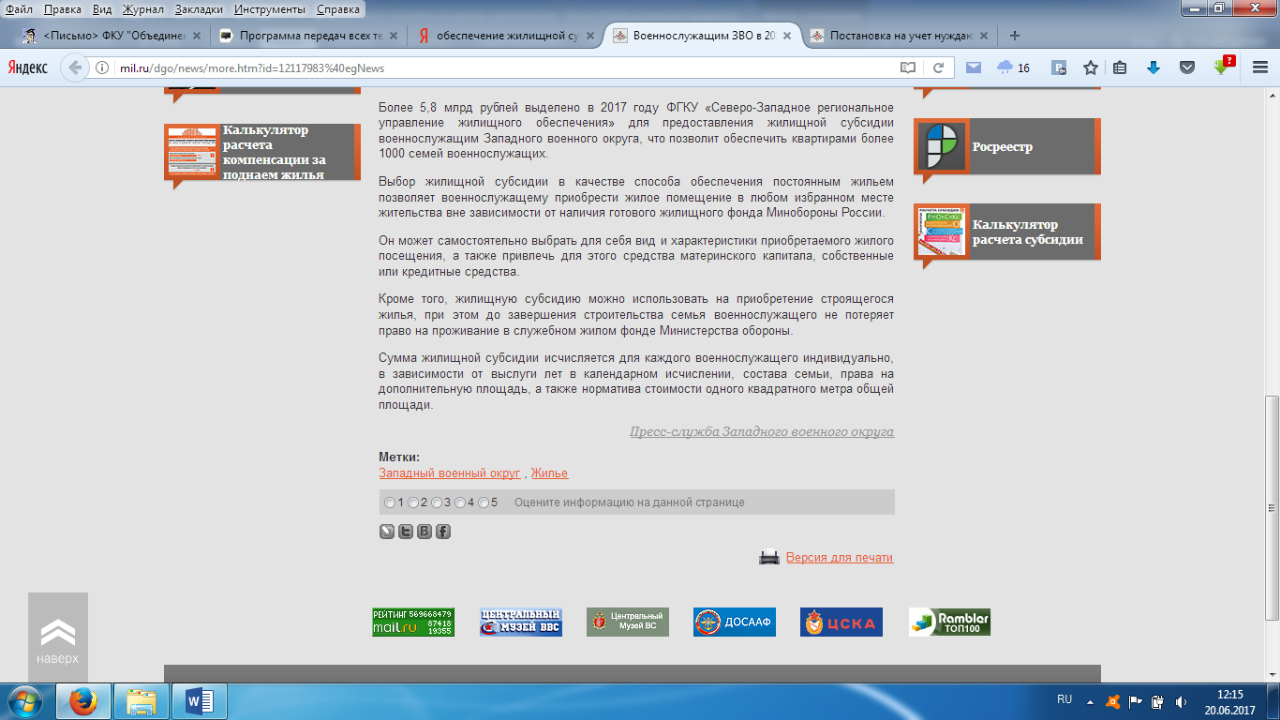 Так же в Федеральном законе «О статусе военнослужащих», статья 15, пункт 1 изложено, что: на весь срок военной службы служебными жилыми помещениями обеспечиваются: военнослужащие, назначенные на воинские должности после получения профессионального образования в военной профессиональной образовательной организации или военной образовательной организации высшего образования и получения в связи с этим офицерского воинского звания (начиная с 1998 года), и совместно проживающие с ними члены их семей. То есть, вышеизложенные положения Федерального закона, ясно свидетельствуют о том, что я имею право на изменение ранее выбранного населенного пункта в качестве избранного места жительства и приобретение жилого помещения на средства жилищной субсидии для постоянного проживания в любом субъекте РФ. При этом, я так же имею право на служебное жилье в течении всего срока военной службы. Такое же видение данного вопроса было изложено на официальном сайте МО РФ, в разделе «Департамент жилищного обеспечения. Новости» в июне 2017 года (скриншот прилагаю к письму). В этой связи считаю противоречащими законодательству РФ основания не включения меня в реестр на выделение жилищной субсидии, высказанные мне по телефону специалистом РУЖО 02 августа 2018 года и считаю, что в данной ситуации нарушается мое право на обеспечение жильем, закрепленное в Законе РФ «О статусе военнослужащих».