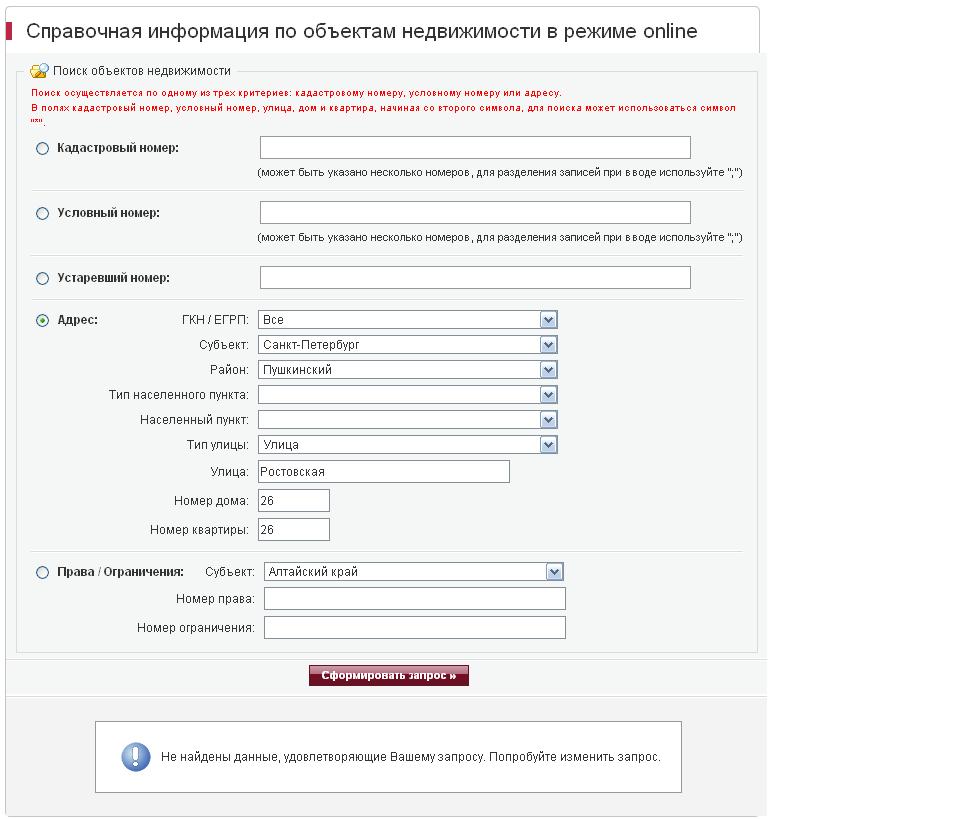 #6746дядя ДОКТОР, да еще с опытом педагогической работы разжевать пытался ))....В этой ветке уже сто раз обьясняли, как пользоваться справочной информацией по объектам недвижимости в режиме online. Вот так пробовали:лажа какая-то....ничего не показывает... Ростовская 25 корп 2Набираю: С-Пб, Ростовская 25 и № кв.....ничего.Нужно набрать только название улицы и № квартиры, ну и естественно Санкт-Петербург, нажать "Сформировать запрос". И в открывшемся списке выбрать № дома и корпус.