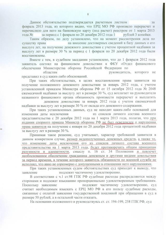 Также указал, что с января 2012 по февраль 2013 ДД выплачено не в полном объеме (надбавка за ВЛ была установлена 25 % вместо 40% - моя выслуга лет была более 25 лет на 01.01.2012 г.)