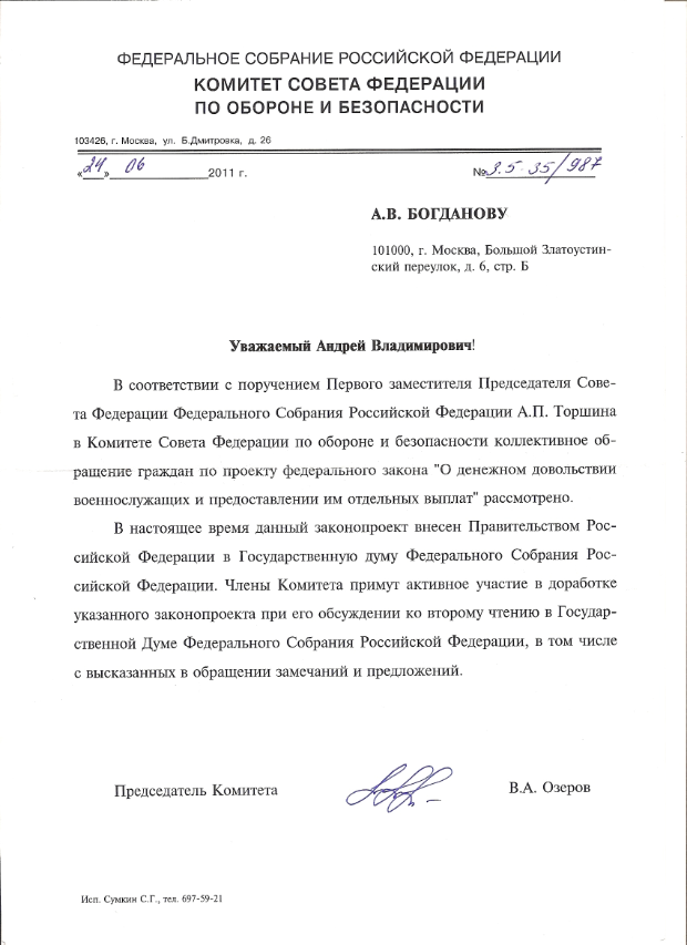 "Законопроекты не содержат положений прямого действия, вместо них — отсылки на будущие подзаконные акты президента, правительства и других органов федеральной исполнительной власти, от которых фактически и будет зависеть размер денежного довольствия. Сергей Решульский категорически настаивал на том, чтобы не рассматривать законопроекты во втором чтении, пока не будут готовы эти нормативные документы. Нельзя голосовать вслепую, уверовав лишь в намерения исполнительной власти. Кроме того, перед вторым чтением надо провести «круглые столы» и «парламентские слушания», чтобы военные пенсионеры и военнослужащие могли публично высказать свои требования и предложения."