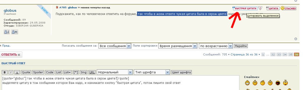 globus,выделите то, что хотите процитировать и нажмите кнопочку "быстрая цитата", и все готово.чтобы в моем ответе чужая цитата была в сером цвете?