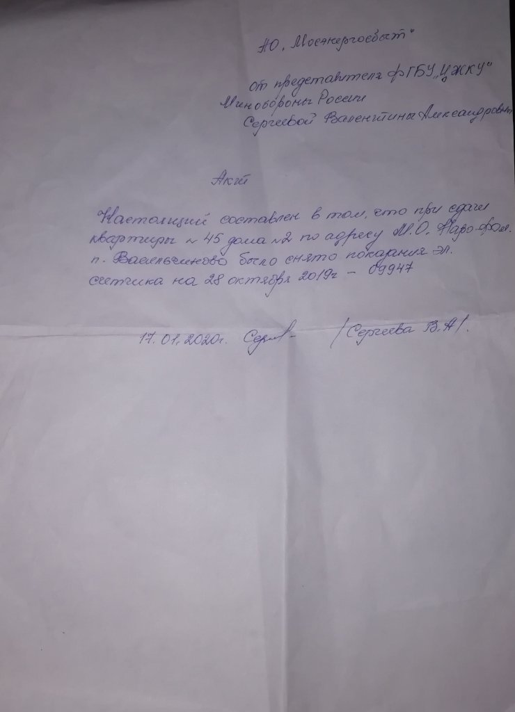 #6945на данный момент акт так и не составлен. Комендант то болеет, то в отпуске, то вирус. На днях к ней заходила, спросила о её начальстве, может оно сделает ей печать, так как за это время ещё у одного человека возникла такая же проблема. Но он заплатил долг, того же мне посоветовала и комендант, а также предложила тупо не съезжать(видимо, думает я до старости тут жить буду). Так вот начальство сказала её в ДЖО. Недолго думая, звоню туда. Там отвечают, что она не является их сотрудником и что помочь мне в этом вопросе не могут. Недавно узнала, что лицевой счёт на электроэнергию служебной квартиры один и не меняется, то есть долги предыдущих жильцов падают на следующих. В юр.отделе ДЖО сказали, что не может такого быть. Уже не знаю кому верить. Но у меня сейчас другой вопрос. Сопровод. От чьего имени его писать и отсылать? И как составить. Заранее спасибо.когда составите акт, а это надо сделать обязательно, раз такая пьянка пошла (если он и без печати, то пусть официальным сопроводом его направят исполнителю услуг (в сопроводе печатей не ставят)), то этого достаточно для подтверждения начальных показаний. я бы ещё устроил скандал по поводу угроз отключения электричества и параллельно написал жалобу в гжи о намерении исполнителя отключить электричество без долга за потребителем, исполнитель не знает порядок уведомления потребителя при отключении..