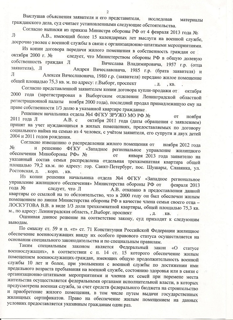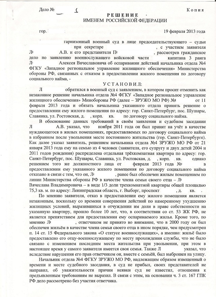 Я, военнослужащий, офицер 2002 года выпуска. Уволен по ОШМ с 04 февраля 2013 года. Признан нуждающимся в получении жилого помещения по договору соц найма с ноября 2011 года. В ноябре 2012 получил извещение на квартиру на семью из 4 человек (я, жена, сын-8 лет и дочь-1 год), согласился, в январе 2013 - решение о предоставлении ЖП по ДСН. В соответствии с требованиями ФЗ "О статусе в/сл", выписались из служебки (находится в ЗАТО), сдали её муниципалитету. 11.02.2013 года я мчал в ДЖО на всех порах - а тут бомба - Решение об ОТКАЗЕ в предоставлении распределённой квартиры. Формулировка: в 2000 году, я как член семьи военнослужащего, а именно своего отца, получил 1/3 доли квартиры (25,1 кв.м) по линии МО РФ. Через неделю квартиру эту мы продали, т.к. она находилась в 130 км (г.Выборг) от места его службы (г.Санкт-Петербург), где он прослужил до 2002 года (уволен по достижению предельного возраста). Согласие его именно на такое далёкое распределение можно понять - выбирать в то время не приходилось, да и 6 лет мытарств по общагам (не от МО) после вывода войск из Латвии... Сосотялся суд: решение об отказе на конкретную распределённую квартиру - законно, но в мотивировочной части - я имею право на (4*18+9) - 25,1 = 55,9 м.кв. Ну ещё ссылка на 1450 приказ - я готов доплатить за 18 к.м.