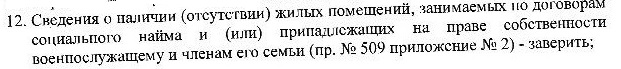 Так, со всеми пунктами вроде разобрался, за исключением последнего, 12-го. Не пойму на какой такой пр.509 прил. 2 идет ссылка, и где эти данные надо заверить? В военкомате это заверять точно не будут. Ранее, при первой сдаче документов, сведения об отсутствии жилья в собственности уже представлял.