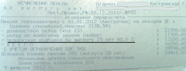 igonik44 писал(а):Начиная с 1 января 2012 года мне исчислена и выплачивается на данный момент пенсия из расчета процентной надбавки за выслугу лет в размере 40% от оклада денежного содержания.