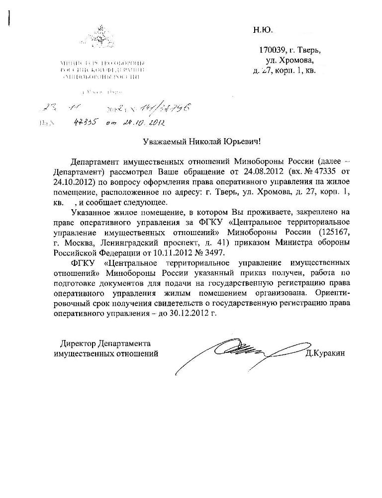 В августе писал письма в ДЖО и в СПЕЦТУИО с требованием зарегистрировать право оперативного управления, описав, что при наличии на руках ДСН не могу получить постоянную прописку в Твери, т.к. право ОУ в росреестре не зарегистрировано. В октябре из ДЖО пришел ответ, что мое заявление рассмотрено и направлено для решения в Департамент имущественных отношений. Вот сегодня прислали письмо из ДИО на электронку с прикрепленным сканированным ответом. (см. приложение).