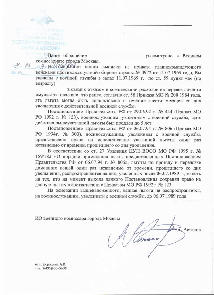 Возвращаюсь к вопросу об отказе в компенсации перевоза личного имущества к ИПМЖ офицеру, уволенному в 1969г. ( проезд и перевоз осуществлялись в 2013г )