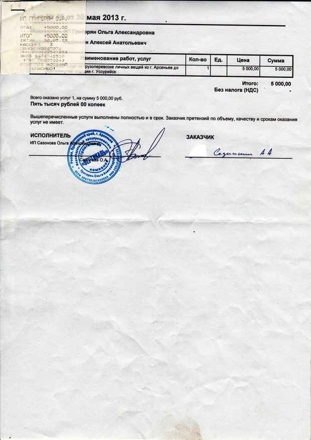 Здравствуйте уважаемые форумчане. После сдачи перевозочных документов в военкомат мне отказали в оплате перевозки личных вещей от места службы до контейнерной станции отправки их к ИМЖ . т.к. мной был арендован грузовой автомобиль не аккредитованной для перевозки фирме(счет фактуру не выдают). В этой фирме выдали кассовый чек и акт (прилагаю). Аккредитованных перевозчиков в нашей местности нет (отдаленный район Приморского края), а официальный перевозчик с контейнерной станции отказался от перевозки т.к. мной отправлялся личный автомобиль (его необходимо "увязывать" внутри контейнера что невозможно сделать вне контейнерной станции). Прошу ответить правомерно ли это и есть ли шансы в суде ?