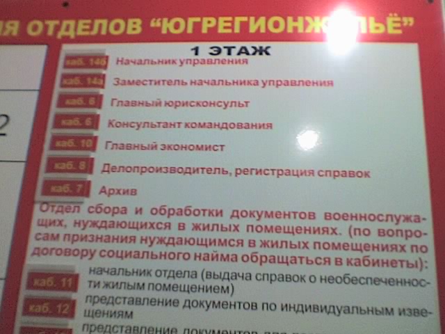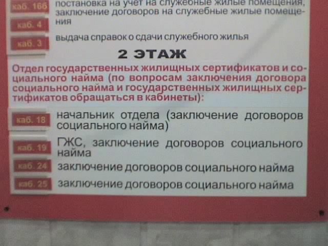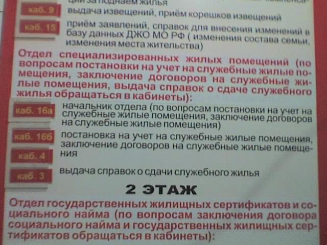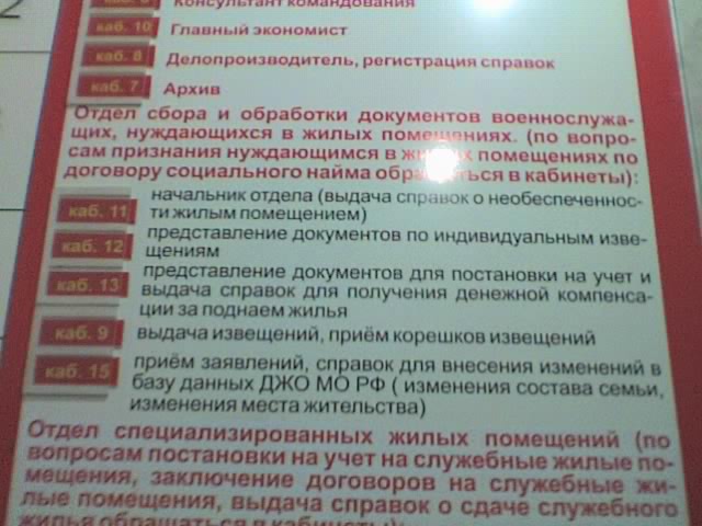 #886В кабинете №3 Наталья Александровна занимается с теми кому нужна справка о сдаче служебного жилья, .т.е если у вас есть Договор социального найма служебного помещения, если в корешке ордера написано что жилое помещение "служебное". Я получал квартиру в ЗВГ в 1995 г., т.е. статус жилого помещения "постоянное". Она отправила меня в кабинет №18 к Сергею Николаевичу. Именно он занимается (?) с теми кому необходимо сдать постоянное жилье полученное от МО РФ.Но должны быть док-ты что жилое помещение находится в ЗВГ, или док-ты что в/сл убывает к новому месту службы, или то что квартира сдается для улучшения жилищных условий(т.е. несоответствие метражу). В противном случае, по их словам, МО РФ считает что обеспечило в/сл постоянным жильем.