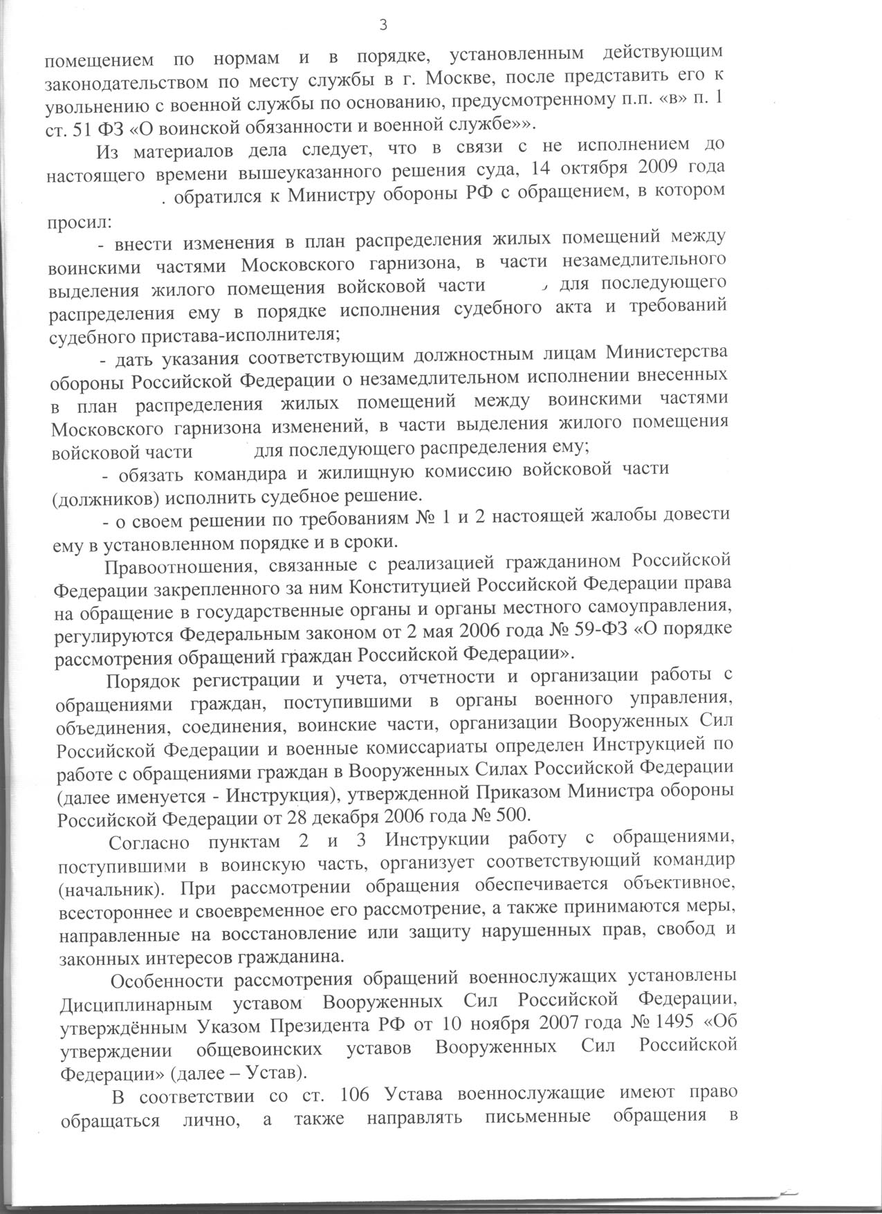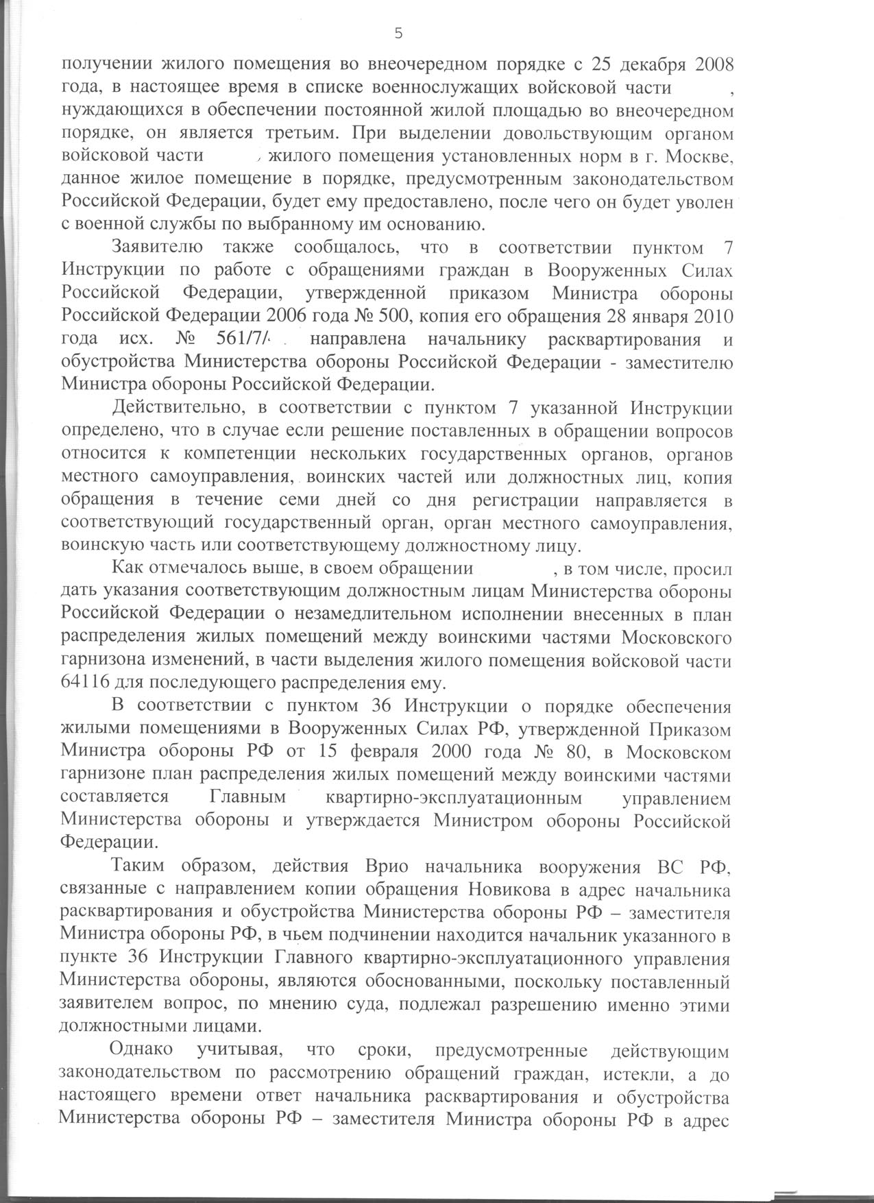"...В соответствии с п.28 и п. 37 Инструкции о порядке обеспечения жилыми помещениями в Вооруженных Силах Российской Федерации функции командира воинской части и жилищной комиссии по предоставлению жилья заключаются в принятии военнослужащих на учет нуждающихся в улучшении жилищных условий и в распределении поступающих в воинскую часть жилых помещений между военнослужащими воинской части в порядке очередности, исходя из времени принятия их на учет и включения в списки нуждающихся в получении жилых помещений (улучшении жилищных условий)..."