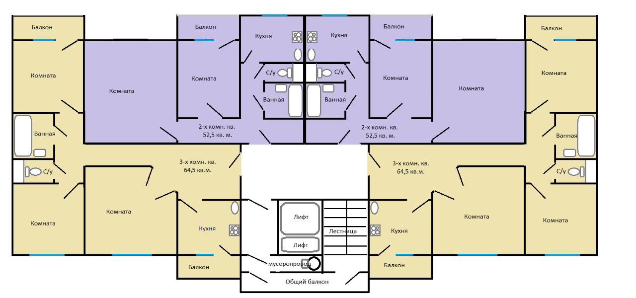 30.03.2018 смотрел квартиры в доме. В углу не был, а средние и крайние подъезды, как я понял однотипные, по 4 квартиры на площадке (две 3-х 64,5 кв.м. и две 2-х 52,5 кв.м.).