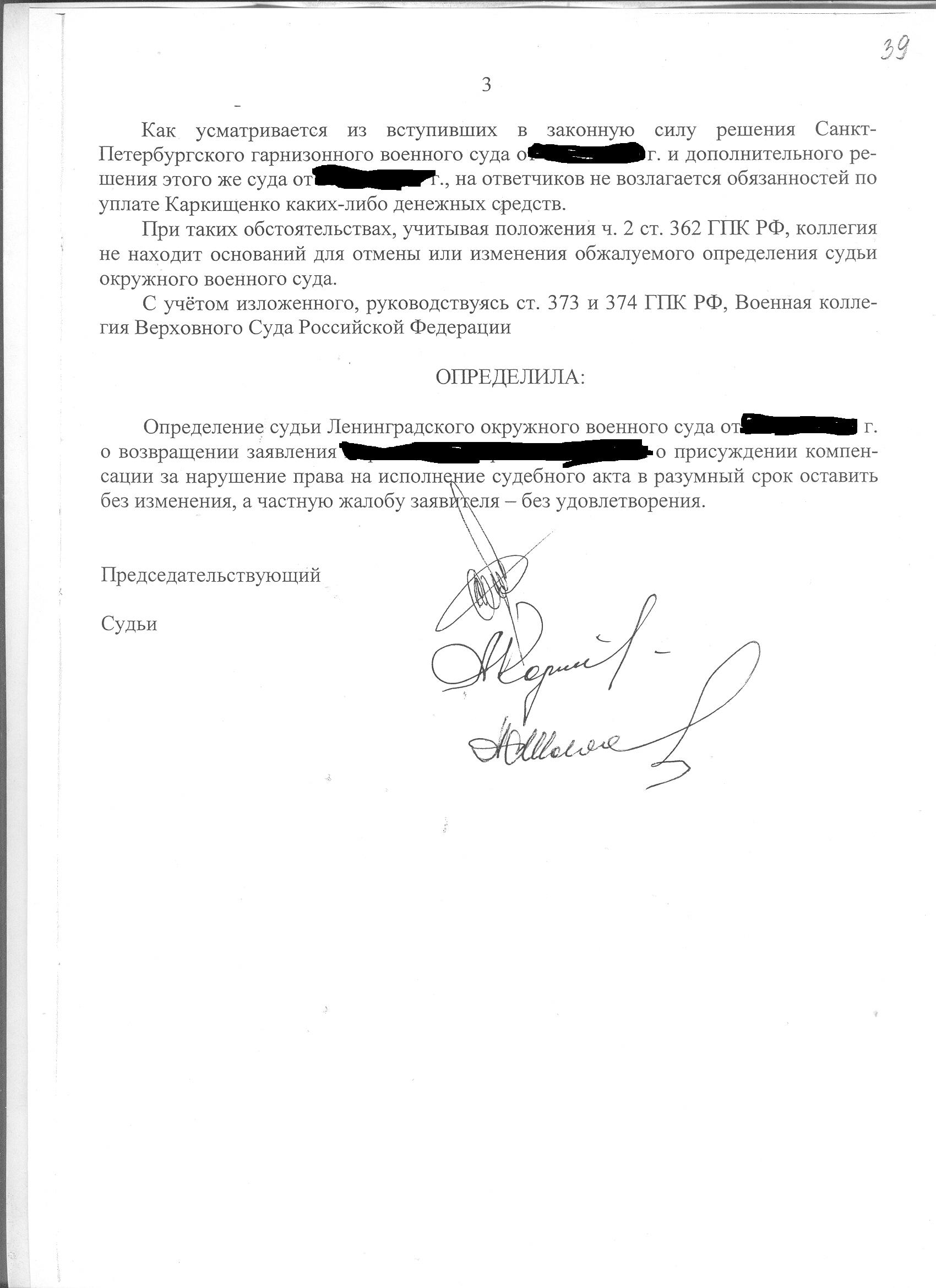 #117Так именно этого и следовало ожидать от нашей судебной власти. В любом случае, в суд подавать на компенсацию нужно, тем кто собирается или уже обратился в ЕСПЧ. Чтобы потом приложить к досье отказное определение суда.Получается, что те в/с у которых не исполняется решение суда по предоставлению жилья длительное время не могут претендовать на денежную компенсацию ( исходя из вышеуказанного кассационного определения и ФЗ № 68)!?