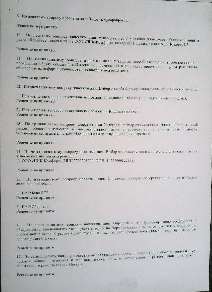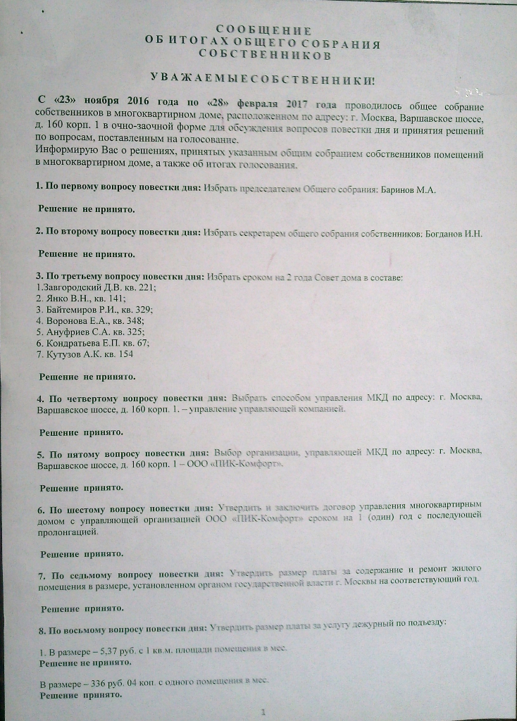 А вот и сообщение, а должен быть протокол, правда по вопросам № 4; 5; 6; 7; 8 ООО "ПИК-Комфорт" не учел решения кто голосовал против, в Мосжилинспекцию документы для проверки не представил, договора управления МКД не заключает, им это не нужно. В общем ООО "ПИК-Комфорт" в своем репертуаре, занимается самоуправством (беспределом), при чем при поддержке (бездействии) надзорных органов и чиновников.
