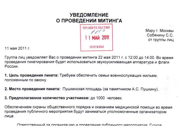 Заявка подана от инициативной группы военсуда и движения Д. Гудкова "Россия вперед!". Представители Союза Советских офицеров также обещали присоединиться и принять участие в митинге. Как только будет окончательное разрешение, сразу будет сообщено всем здесь на форуме.
