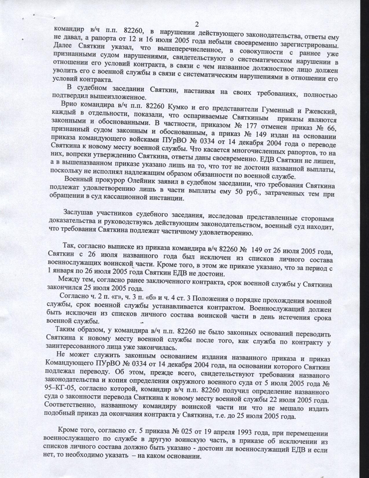 Прочтите страничку одного из моих решений. Обратите внимание на даты. С момента издания приказа о моем переводе до окончания контракта было 7 с лишним месяцев. У Вас же еще неизвестно когда будет приказ о переводе, и будет ли он вообще. Все что Вы знаете это пока лишь угрозы.Кром того, я не зря в своем предыдущем сообщении заострял внимание на то, что еще не известно по какой замене (плановой или по служебной необходимости ) отправят Вашего мужа. Если по плановой - шансы возрастают. Если все же перевод будет по служебной - тяниете время - суд, ходатайство об обеспечении иска, госпиталь, ВВК, отпуск, вобщем сами думайте, вы может еще что то знаете. Согласен 9 месяцев тянуть сложно, но невозможного нет, и тому пример читайте в решении суда.в общем перспектив никаких.....очень грустно!спасибо всем кто откликнулся!