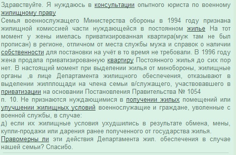 Правда, я сон потеряла, но лучше быть готовой ко всему. Меня, правда, очень тревожит еще вопрос - не признают ли мужа незаконно поставленным в очередь на жилье? Мы в то вре мя все были прописаны при части. Те более, он все равно к этой квартире никакого отношения не имел. За него обидно будет