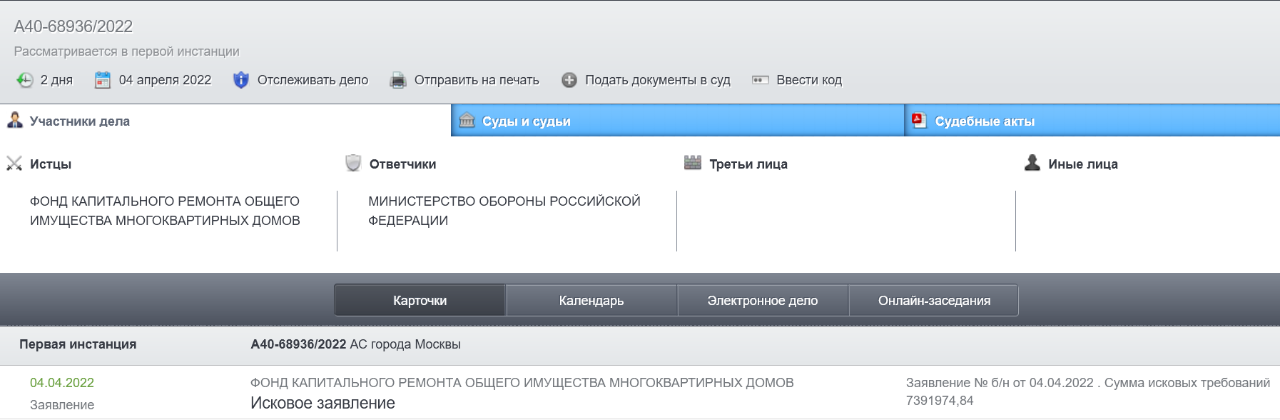 #946Фонд капитального ремонта Московской области обратился в арбитражный суд с иском к Минобороны РФ о взыскании 7 391 974 руб. 84 коп.