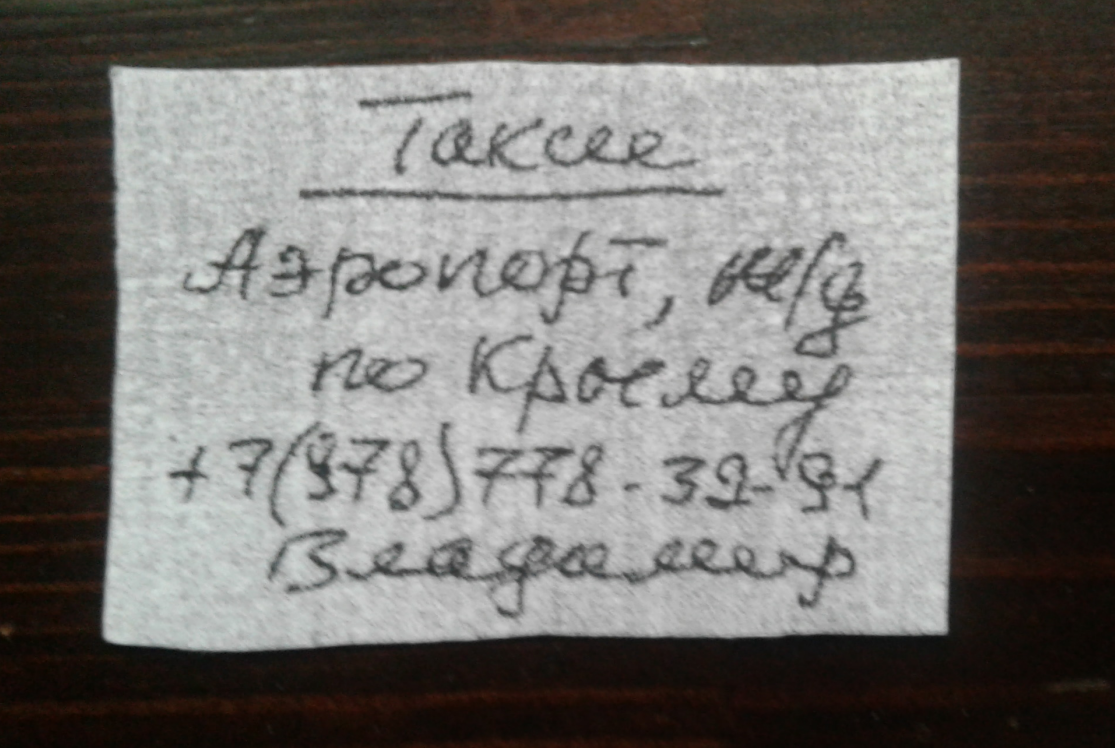 Ожидая в этом году такси у северной проходной санатория (со стороны Севастопольской улицы), получил на руки от подрабатывающего извозом некого Сергея такую вот «визитку»: