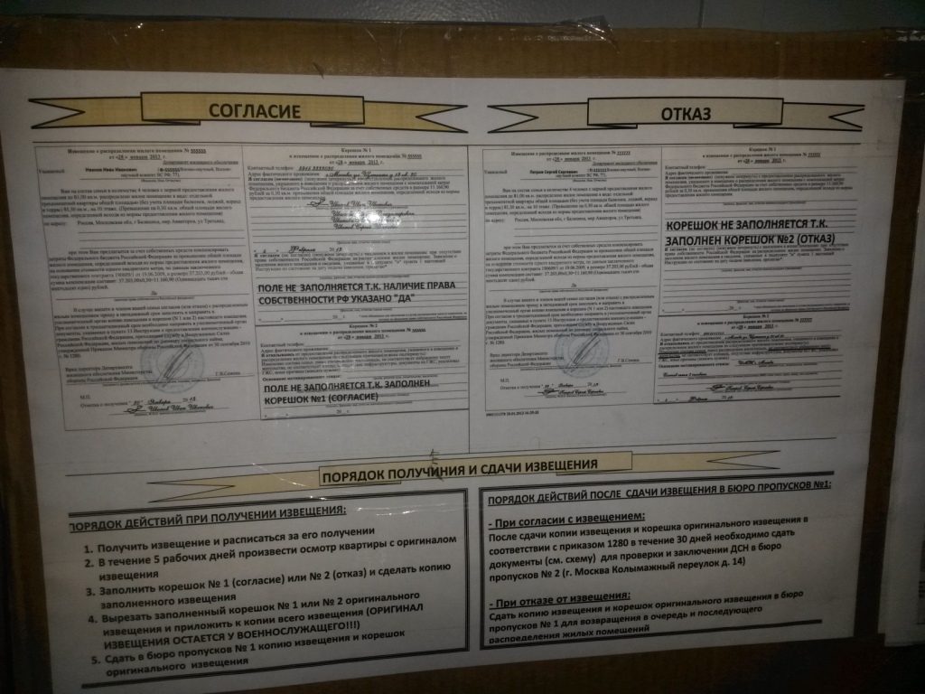 #9840У нас тоже так было. Получили извещение на троих,уже посмотрели. Так что не волнуйтесь раньше времениВот дрянь то какая… стоял на учете с марта 2013, уволенный по ОШМ, составом семьи 3 человека. В прошлую неделю жену и дочь исключили и буквально через пару дней появились данные о распределении квартиры. Ну не ?уки, а!? И как теперь бодаться? Пока очередной раз буду доказывать законность состочния в очереди семьи, пройдут сроки, откажусь - впихнут компенсацию… замкнутый круг.
