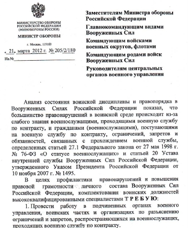 #1Письмо Министра обороны РФ от 21.03.2012 N 205/2/180