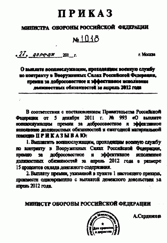 #6Приказ Министра обороны РФ № 1018 от 27 апреля 2012 г. "О выплате военнослужащим, проходящим военную службу по контракту в Вооруженных Силах Российской Федерации, премии за добросовестное и эффективное исполнение должностных обязанностей за апрель 2012 года"