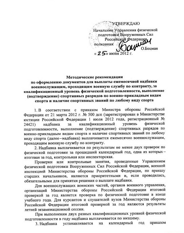 Методические рекомендации по оформлению документов для выплаты ежемесячной надбавки военнослужащим, проходящим военную службу по контракту, за квалификационный уровень физической подготовленности, выполнение (подтверждение) спортивных разрядов по военно-прикладным видам спорта и наличие специальных спортивных званий по любому виду спорта.