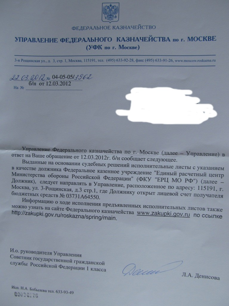 Ответ управления федерального казначейства по г. Москве (УФК по г. Москве) -