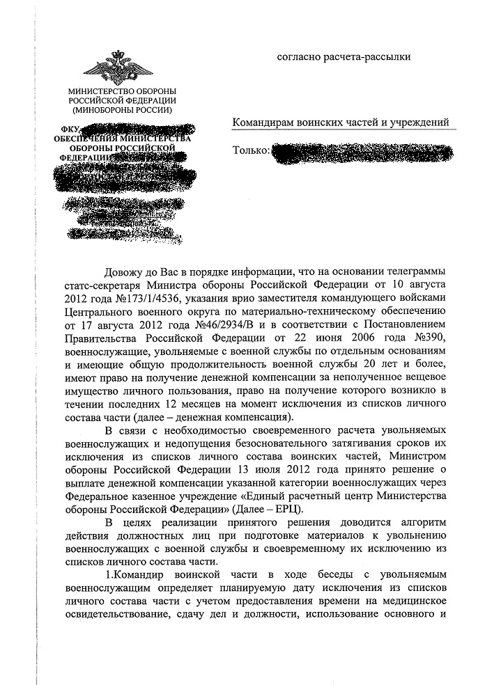 Временный порядок доставки расчетных листков и других данных, направляемых в воинские части из ФКУ ЕРЦ МО РФ -