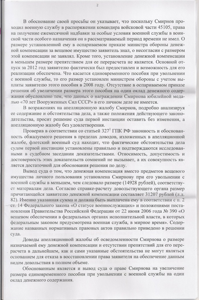 В обоснование заявленных требований Смирнов С.П. в судебном заседании пояснил, что приказом Министра обороны РФ № 1459 от 14 июня 2012 года он был исключен из списков личного состава войсковой части № с 1 июля 2012 года. При этом денежное довольствие было ему выплачено по 30 июня 2012 года в июле 2012 года, а не в день, предшествующий убытию в отпуск при увольнении, а выписка из приказа об исключении его из списков личного состава части поступила в часть только 6 августа 2012 года. Основной отпуск за 2012 год пропорционально прослуженному времени ему не предоставлялся. В приказе МО РФ об исключении его из списков личного состава части размер единовременного пособия при увольнении неправомерно указан без увеличения его размера на один оклад денежного содержания как военнослужащему, удостоенному в период прохождения военной службы государственной наградой СССР, а также с зачетом ранее выплаченных 20 окладов денежного содержания в 2008 году, и размер денежной компенсации взамен неполученного вещевого имущества также указан в меньшем размере. При этом, указанные выплаты ему до настоящего времени не произведены, а денежное довольствие с 1 января 2012 года ему выплачивалось без ежемесячной надбавки за особые условия военной службы как военнослужащему, проходящему службу по контракту в воинской части особого назначения.