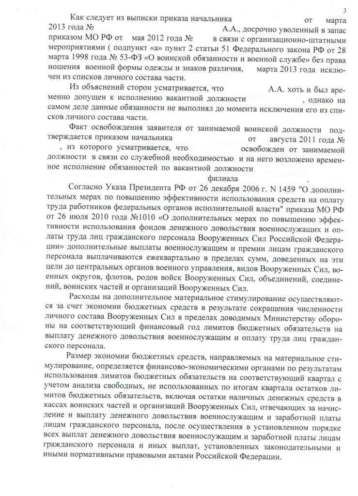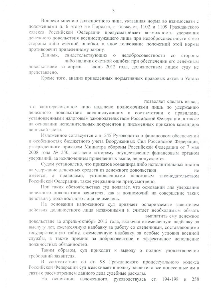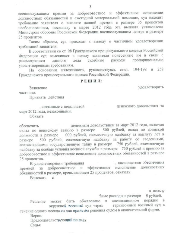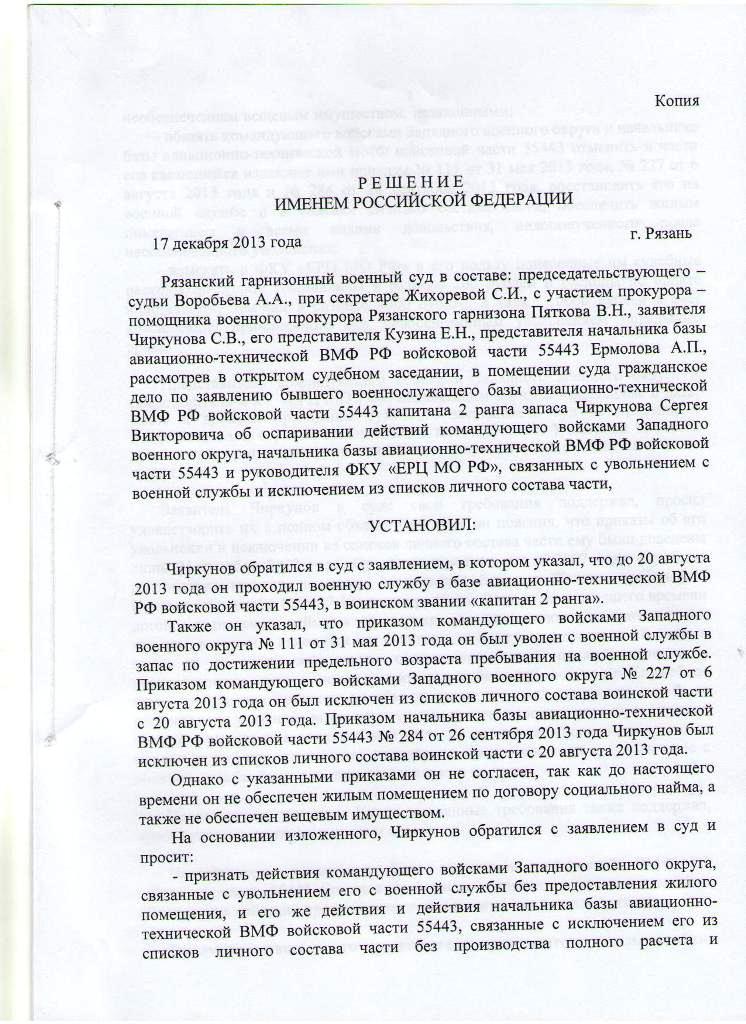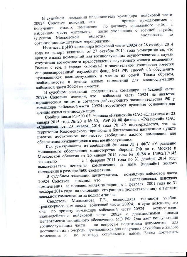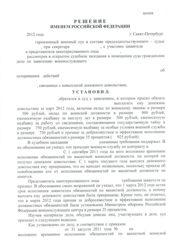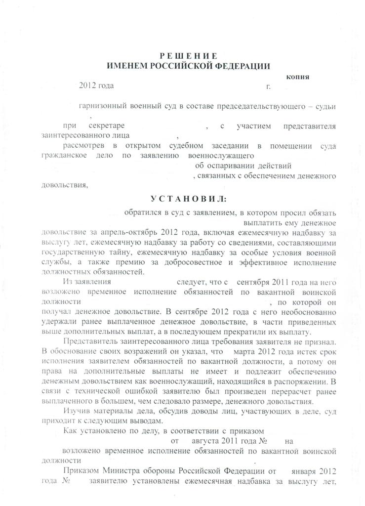 Также поразительно то, что про пункт 59 Положения “О квартирно-эксплуатационной службе и квартирном довольствии Советской Армии и Военно-Морского Флота”, утвержденного приказом Министра обороны СССР № 75 от 22 февраля 1977 года (с изменениями от 26 июня 2000 г., 1 сентября 2008 г., и 2 мая 2012г.) где четко и недвусмысленно указанно, что обязанность по аренде жилых помещений для военнослужащих возложена на воинские части, в решении странным образом не рассматривалось. Это первые впечатления. Да, прошу всех кому интересно, делится мыслями, на что мне сделать упор при написании апелляции. Выкладываю саму жалобу в суд, объяснение и само решение. Заранее спасибо!