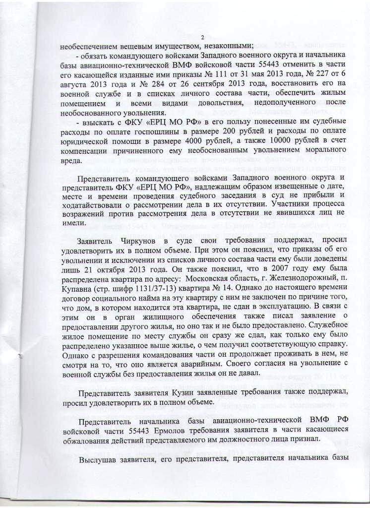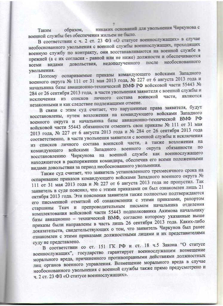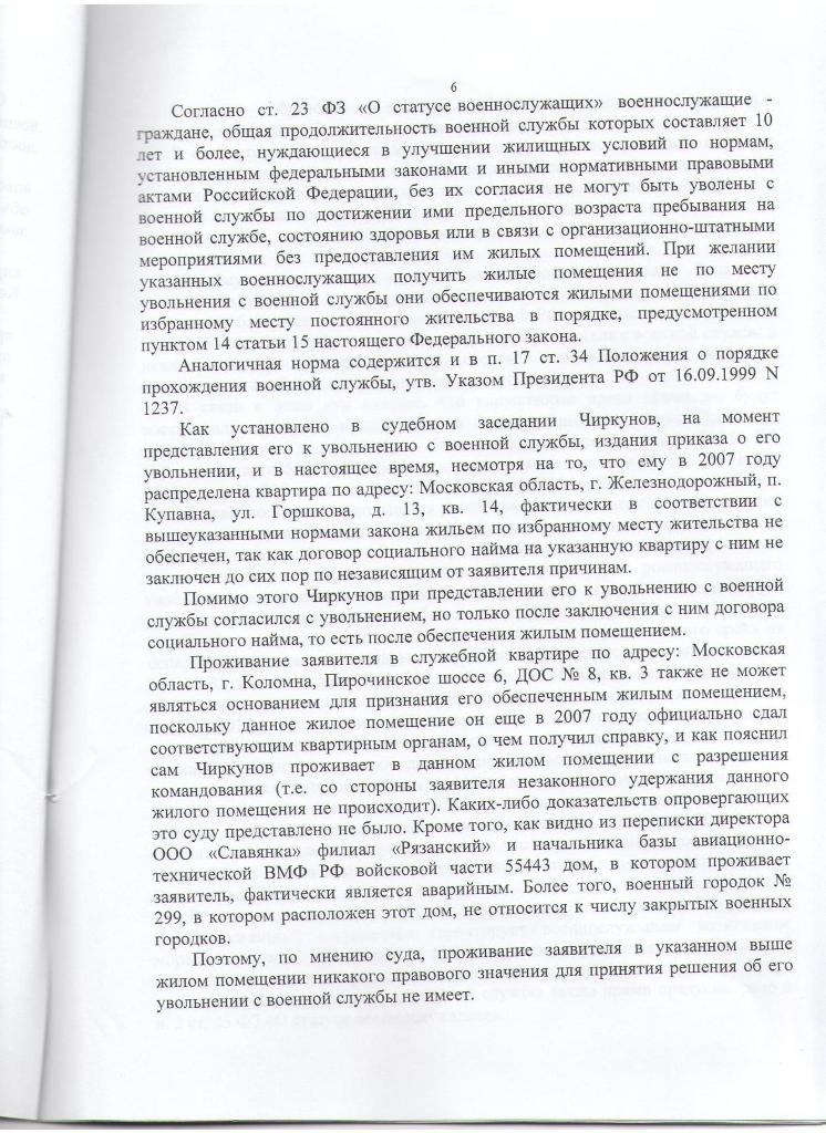 Чусовитину А.Д. в удовлетворении заявления об оспаривании действий командира в/части ФИО7, связанных с исключением из списков личного состава воинской части при увольнении с военной службы без обеспечения жилым помещением по избранному после увольнения постоянному месту жительства – отказать.