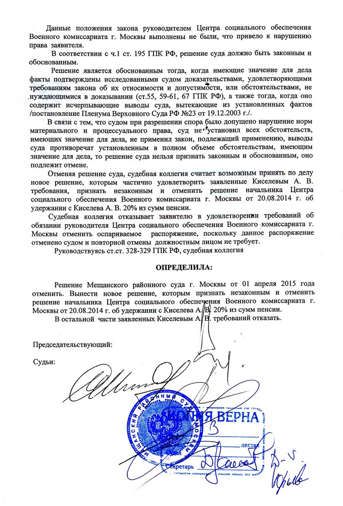 #7Уважаемые форумчане, не прошло и года "мытарств", как вопрос об удержании из моей пенсии 20% подошел к завершению. За восстановлением своих прав пришлось обратиться в Зюзинский районный суд города Москвы, который в ноябре 2014 года вынес Решение об удовлетворении исковых требований, так как не усмотрел в моих действиях после увольнения признаков злоупотребления правами и недобросовестности в отношении органов пенсионного обеспечения. Представители облвоенкомата подали Апелляционную жалобу в МГС, Коллегия которого 26 мая 2015 г. определила законность Решения Зюзинского районного суда.