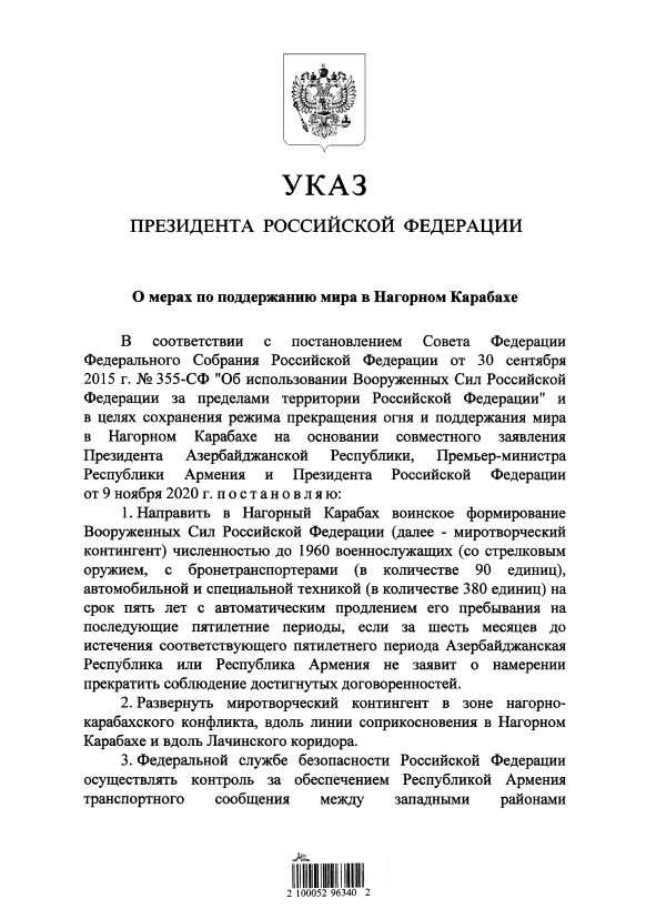Указ Президента Российской Федерации от 10.11.2020 № 695 "О мерах по поддержанию мира в Нагорном Карабахе"