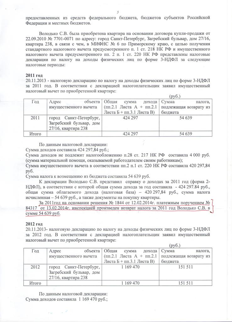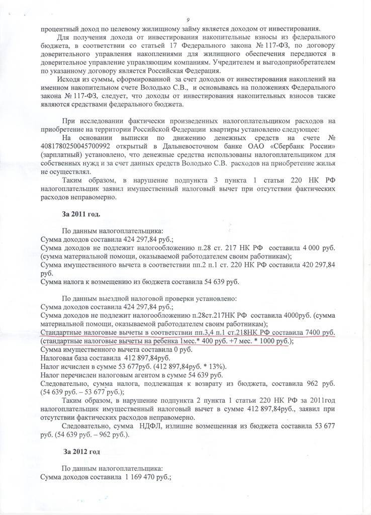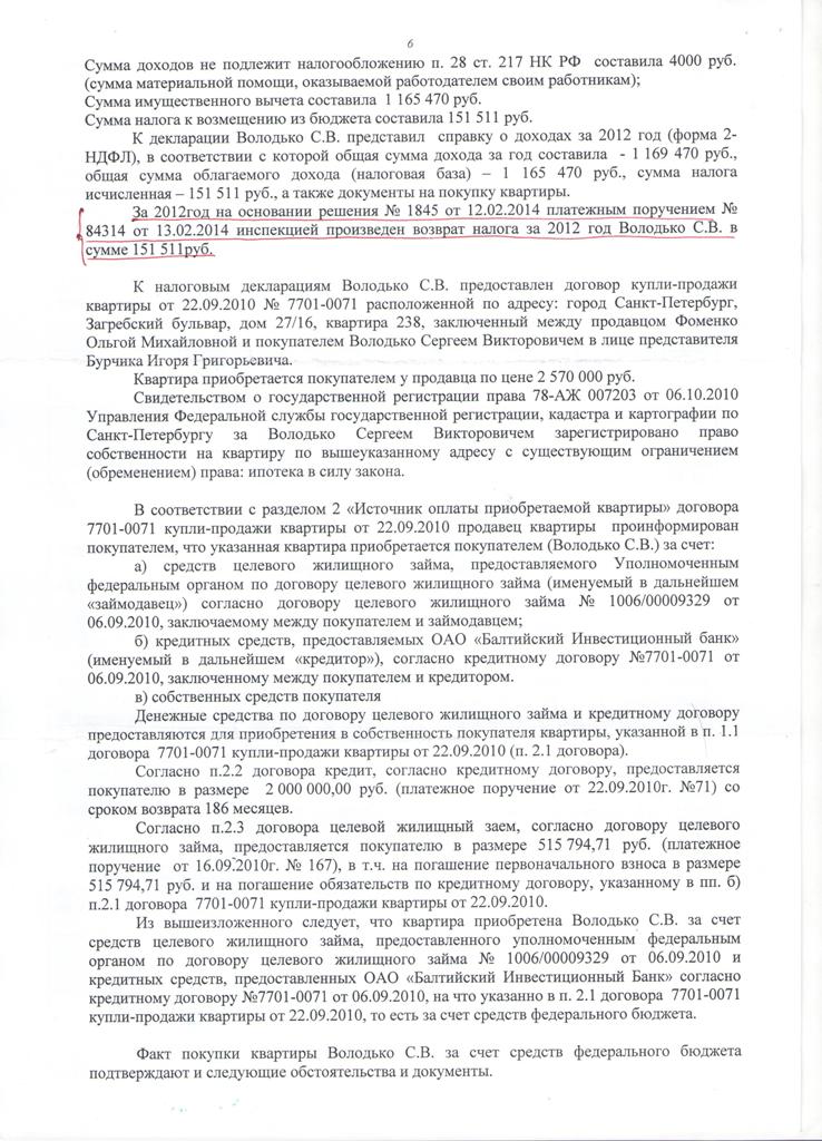 Доброго времени суток! На меня прокуратура подала в суд по поводу налогового вычета и выиграла дело (файл Суд 2). Я долго не проверял почтовый ящик и не знал про суд. Я хочу подать жалобу в районный суд. Как лучше поступить: 1) обосновывать, что вычет положен с заемных средств, т.к. ЦЖЗ даётся до 20 лет льготной выслуги, а она у меня ещё не наступила; 2) может быть прошел срок давности 3 месяца? (в прошлом году налоговая обнаружила ошибку в декларации за 2012 г.) 3) обосновать, что вычет положен с процентов по потребительскому кредиту, который я добавлял в стоимость квартиры, 13% с суммы от инвестиций и с суммы последнего платежа по ипотечному кредиту в 2027 г. - 0,13*500000 р. 4) может это халатность налоговой? (я же уверен, что вычет положен с заемных средств, есть судебная практика в пользу военнослужащих). К тому же копию искового заявления и судебную повестку я не получал. Предыстория: по ошибке в декларации за 2012 г. налоговая тоже подавала на меня в мировой суд в начале этого года, суд выдал Определение и передал первое дело в военный суд. Военный суд меня амнистировал из-за срока давности более 3-х месяцев.